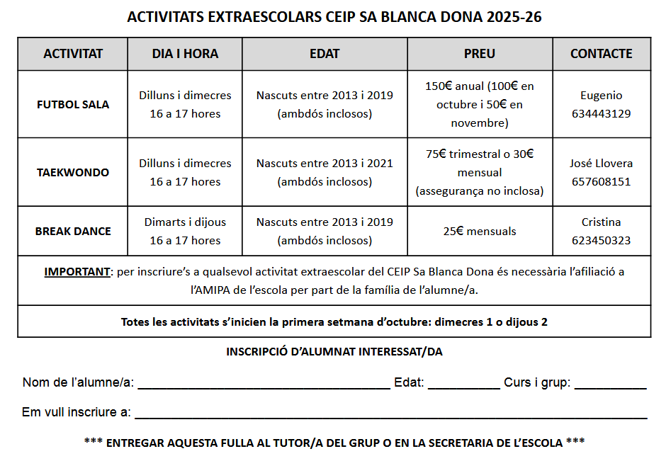 Activitats Extraescolars 25/26 Clicant damunt de la imatge podeu descarregar la circular per poder imprimir-la i presentar-la a l’escola.