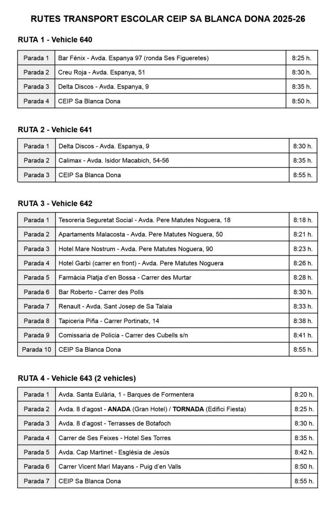 Els alumnes del centre disposen de 4 rutes diferents per venir a l’escola. Aquest és un servei gratuït per als alumnes de l’escola. Per poder emprar aquest servei, han de disposar d’un carnet de transport que expedeix la direcció de l’escola cada curs. El servei està operatiu tots els dies lectius del curs, des del primer dia de classe (10 de setembre de 2025) fins al darrer (19 de juny de 2026).
